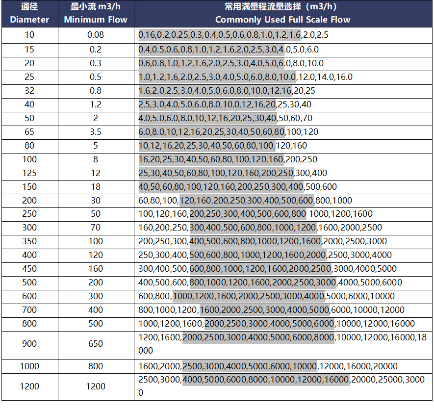 注:带灰色底纹的为推荐最佳流量,如流量标定要求最小值或最大值,可以跟据客户要求进行重新标定。